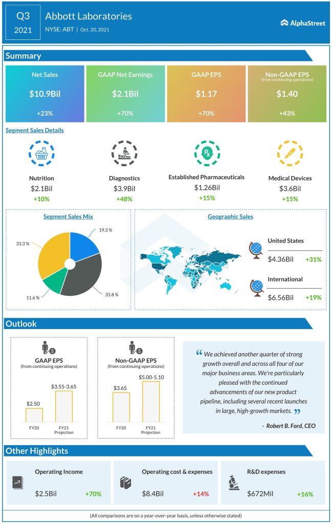Abbott (NYSE: ABT) today reported its third quarter financial results for the period ended September 30, 2021.