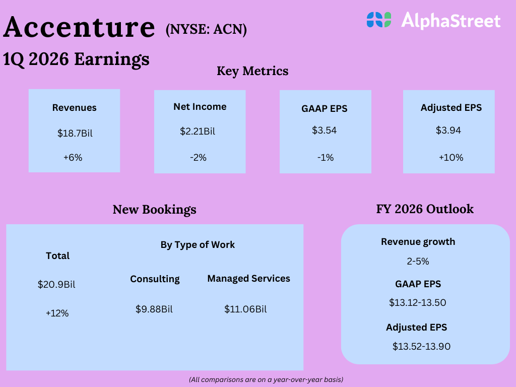 For fiscal year 2026, Accenture expects revenue growth to be 2-5% in local currency. GAAP EPS is expected to be $13.12-13.50, up 8-11% YoY. Adjusted EPS is expected to be $13.52-13.90, up 5-8% YoY.