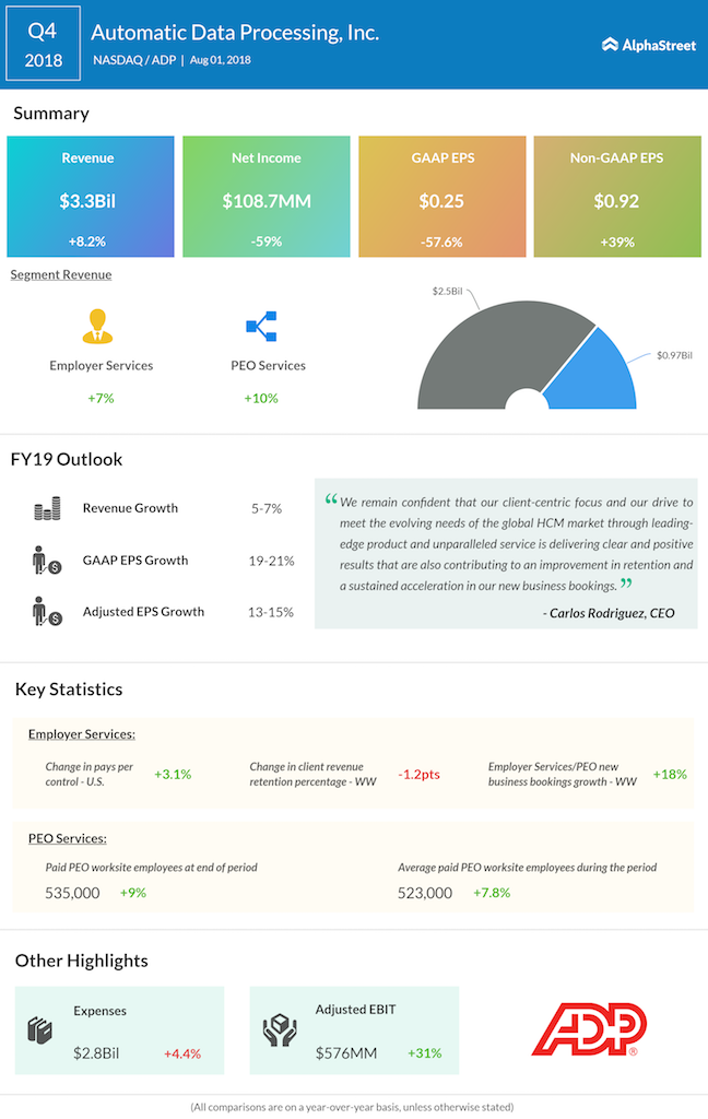 HR services provider Automatic Data Processing (ADP) today reported a steep 59% decline in Q4 2018 earnings. This decrease was mainly due to the impact of pre-tax charges of $365 million related to the company’s Voluntary Early Retirement Program and other transformation initiatives. Shares of ADP dipped more than 3% when the market opened today and continued to trade in the negative territory.