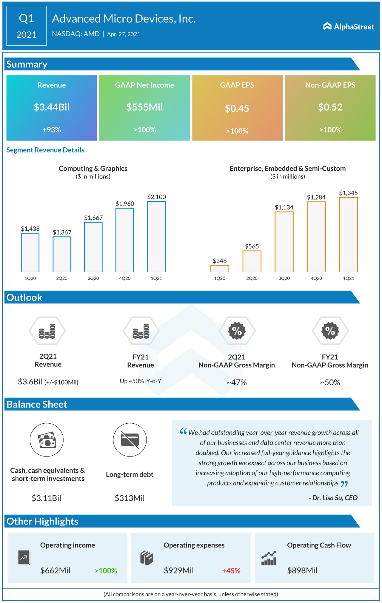Advanced Micro Devices (NASDAQ: AMD) today reported its first quarter financial results for the period ended March 27, 2021.
