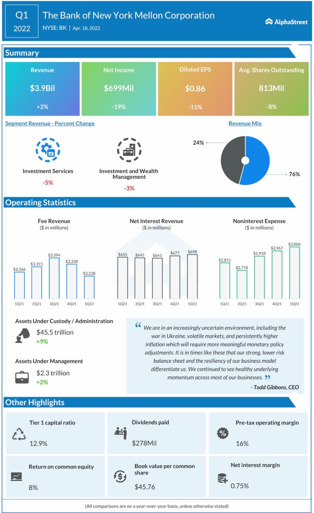 The Bank of New York Mellon Corporation (NYSE: BK) reported first-quarter 2022 earnings results today.