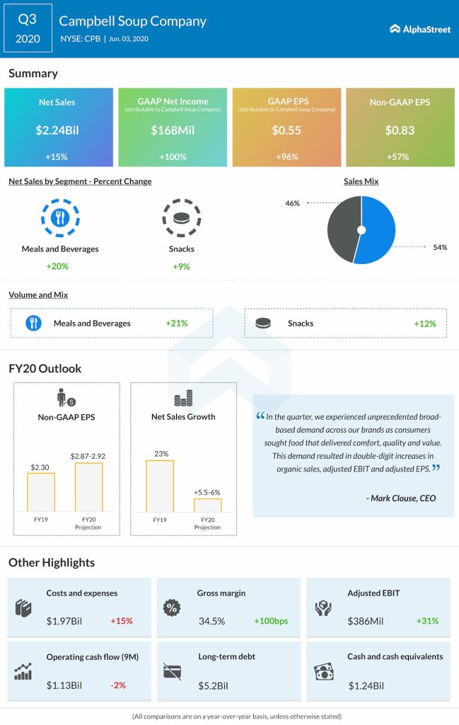 Net sales rose 5% year-over-year to $2.27 billion, reflecting continued elevated demand for Campbell’s brands.