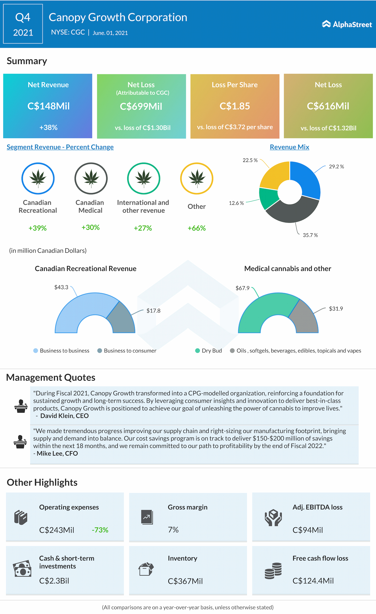 Total revenue increased 23% year-over-year to CAD136 million, driven by double-digit growth across Canadian cannabis and other consumer products.