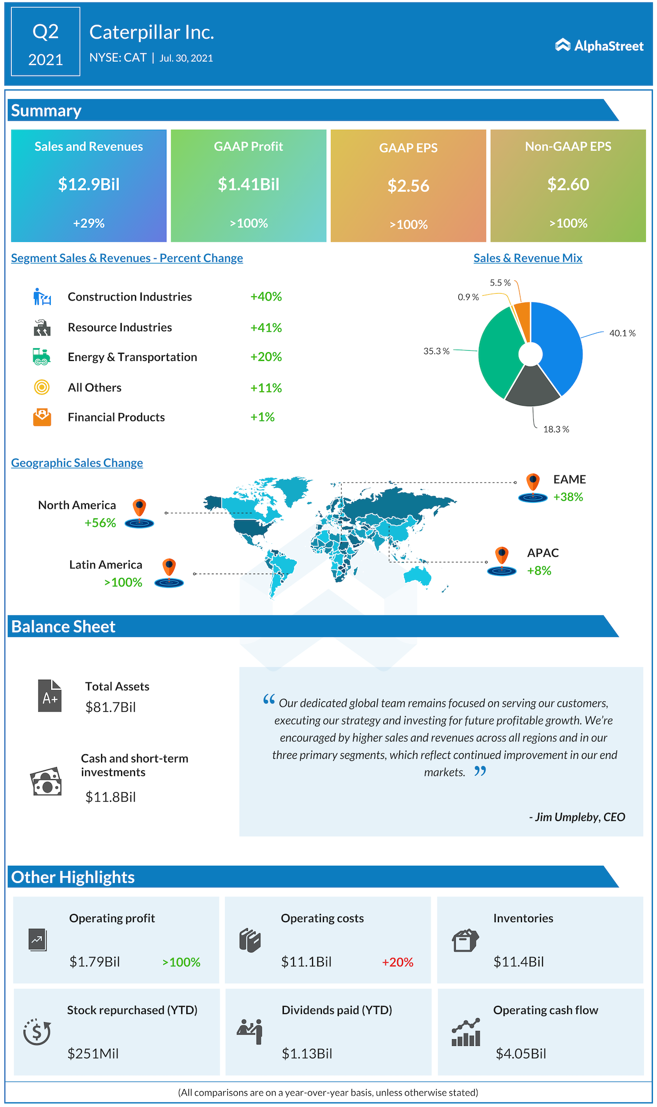 Caterpillar Inc (NYSE: CAT) reported second-quarter 2021 financial results before the regular market hours on Friday. The manufacturer of construction machinery and equipment reported Q2 revenue of $12.9 billion, up 29% year-over-year and higher than the Wall Street projection. Net income of $2.60 per share was also above the target that analysts had anticipated.