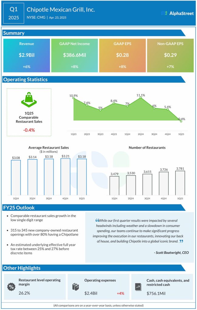 Chipotle Mexican Grill, Inc. (NYSE: CMG) reported total revenue of $2.9 billion in the first quarter of 2025, up 6.4% compared to the year-ago period, driven by new restaurant openings.