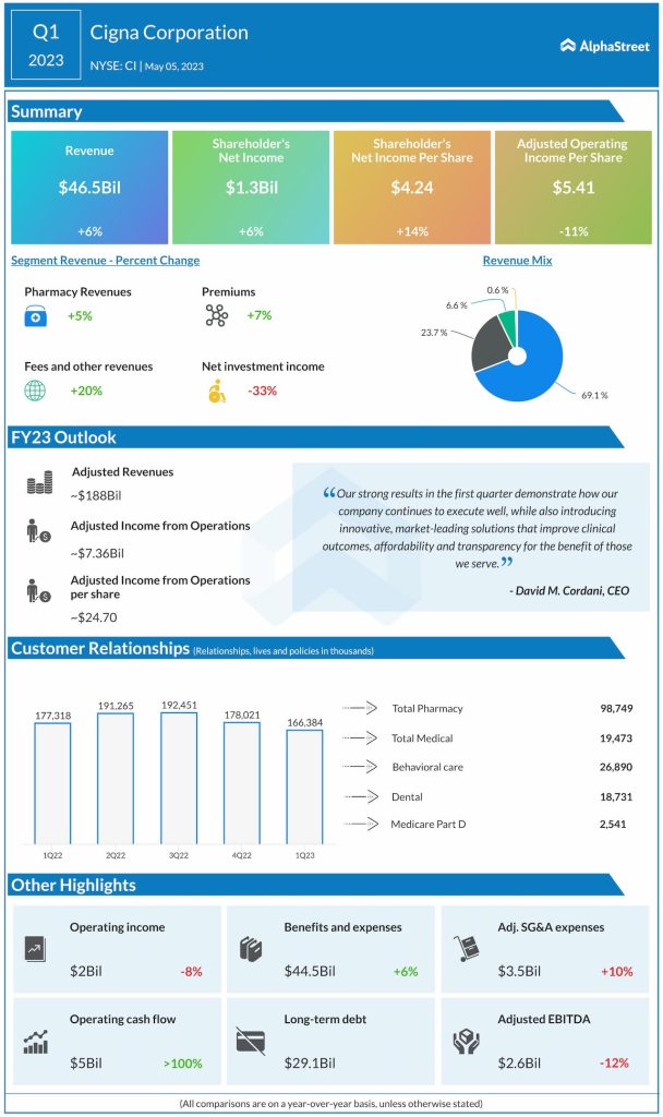Adjusted operating income, on a per-share basis, rose 20% year-over-year to $6.47 in Q1. For the full fiscal year, Cigna is looking for an adjusted operating profit of around $8.07 billion.