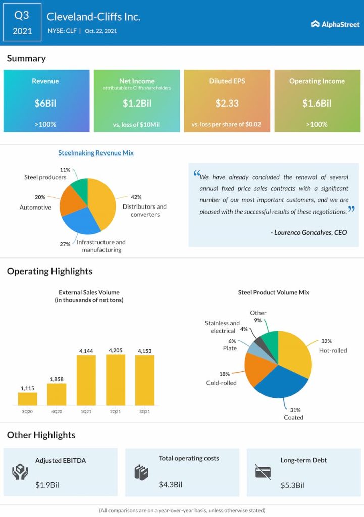 Cleveland-Cliffs Inc. (NYSE: CLF) reported consolidated revenues of $6 billion for the third quarter of 2021 compared to $1.6 billion in the year-ago period.