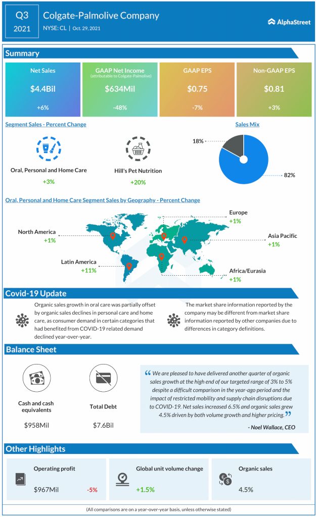 Colgate-Palmolive Company (NYSE: CL) reported net sales of $4.4 billion for the fourth quarter of 2021, which was up 2% year-over-year.