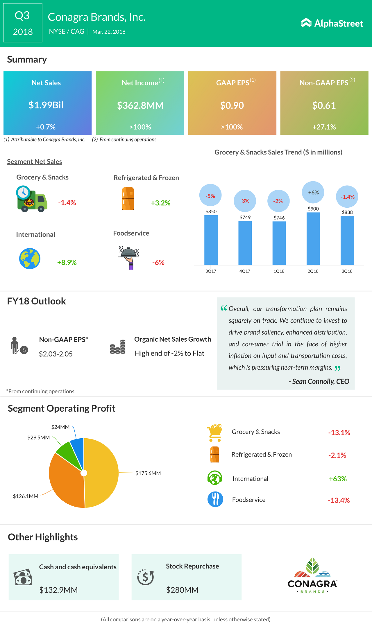 ConAgra lifted its 2018 outlook as it offset higher commodities and shipping costs by reducing expenses and discount offers. The company now expects adjusted EPS to be in the range of $2.03 to $2.05 compared to the prior outlook of $1.84 to $1.89 per share.
