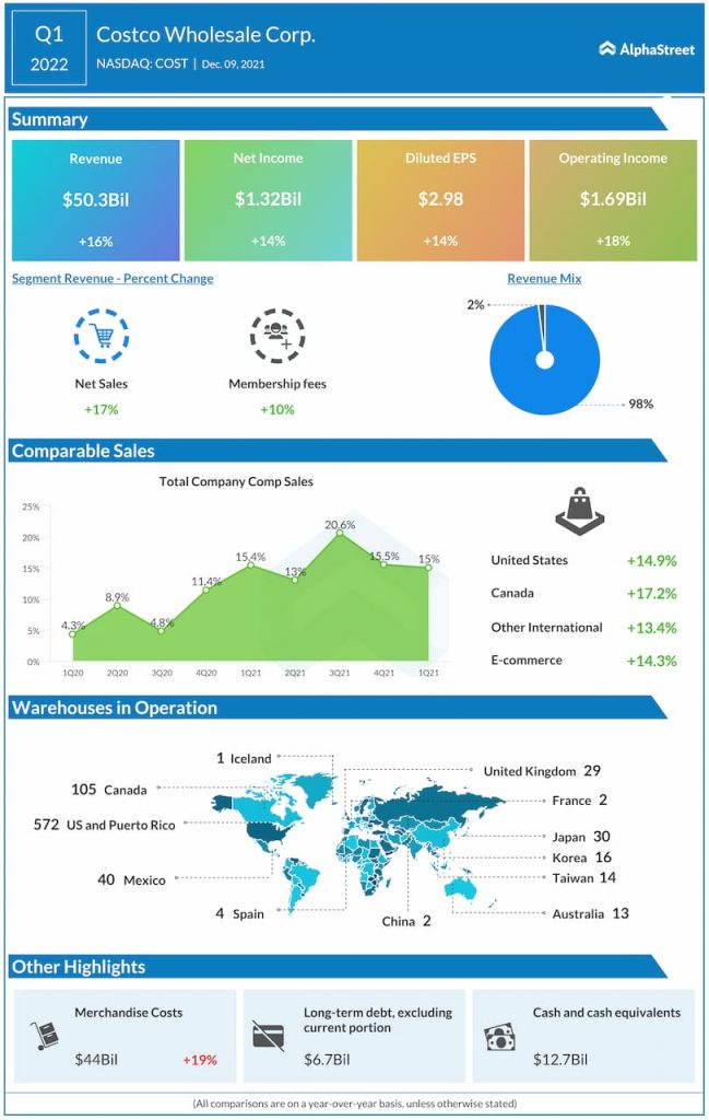 Costco Wholesale Corporation (NASDAQ: COST) reported total revenue of $50.3 billion for the first quarter of 2022, up 16% year-over-year.