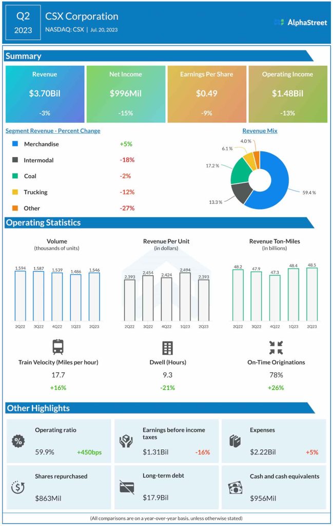 CSX Corp. (NASDAQ: CSX), a rail-based freight transportation company, has reported lower revenues and net profit for the third quarter of 2023.