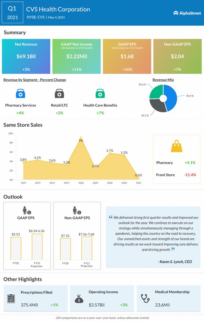 Net income attributable to CVS was $2.78 billion, or $2.10 per share, compared to $2.98 billion, or $2.26 per share, in the year-ago period. Adjusted EPS amounted to $2.42.