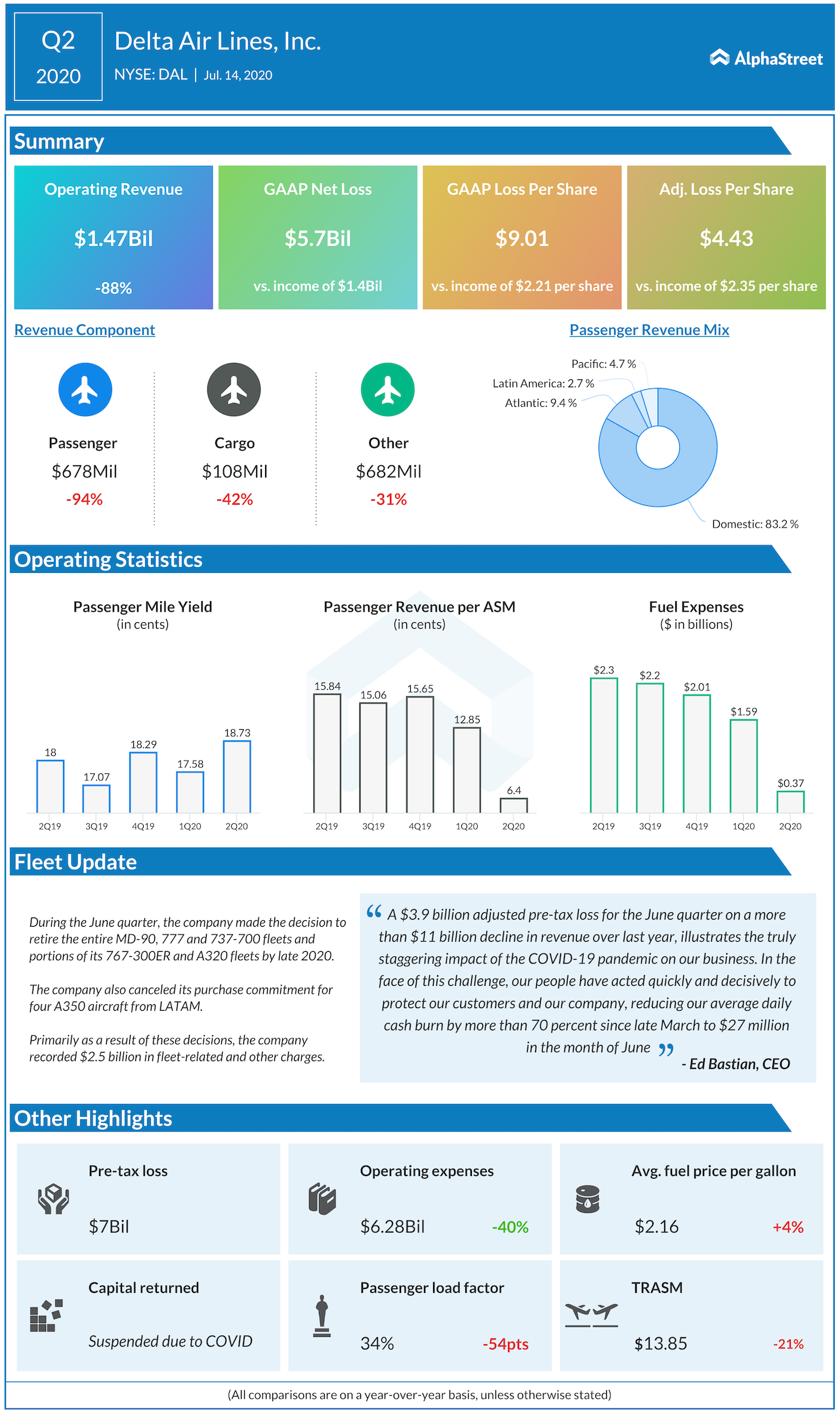 Following a challenging flying season, Delta Air Lines (NYSE: DAL) on Tuesday kicked off the aviation earnings with mixed results. Second quarter revenues fell 88% year-over-year to $1.47 billion, while loss per share came in at a massive $4.43.