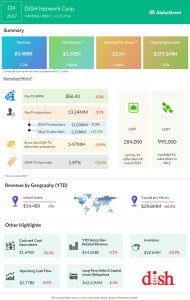 The entire Pay-TV domain is suffering. The growing interest in cord-cutting has impacted the Douglas County Dish Network even more when compared to other Pay-TV providers. The company reported just over 7% drop in its fourth quarter revenue to $3.48 billion from $3.75 billion a year ago. However, profit surged in the final quarter of 2017, mainly due to the income tax benefit of about $1.2 billion from the recent tax reform.  Earnings stood at $2.64 per share compared to $0.73 per share during the same period of 2016.