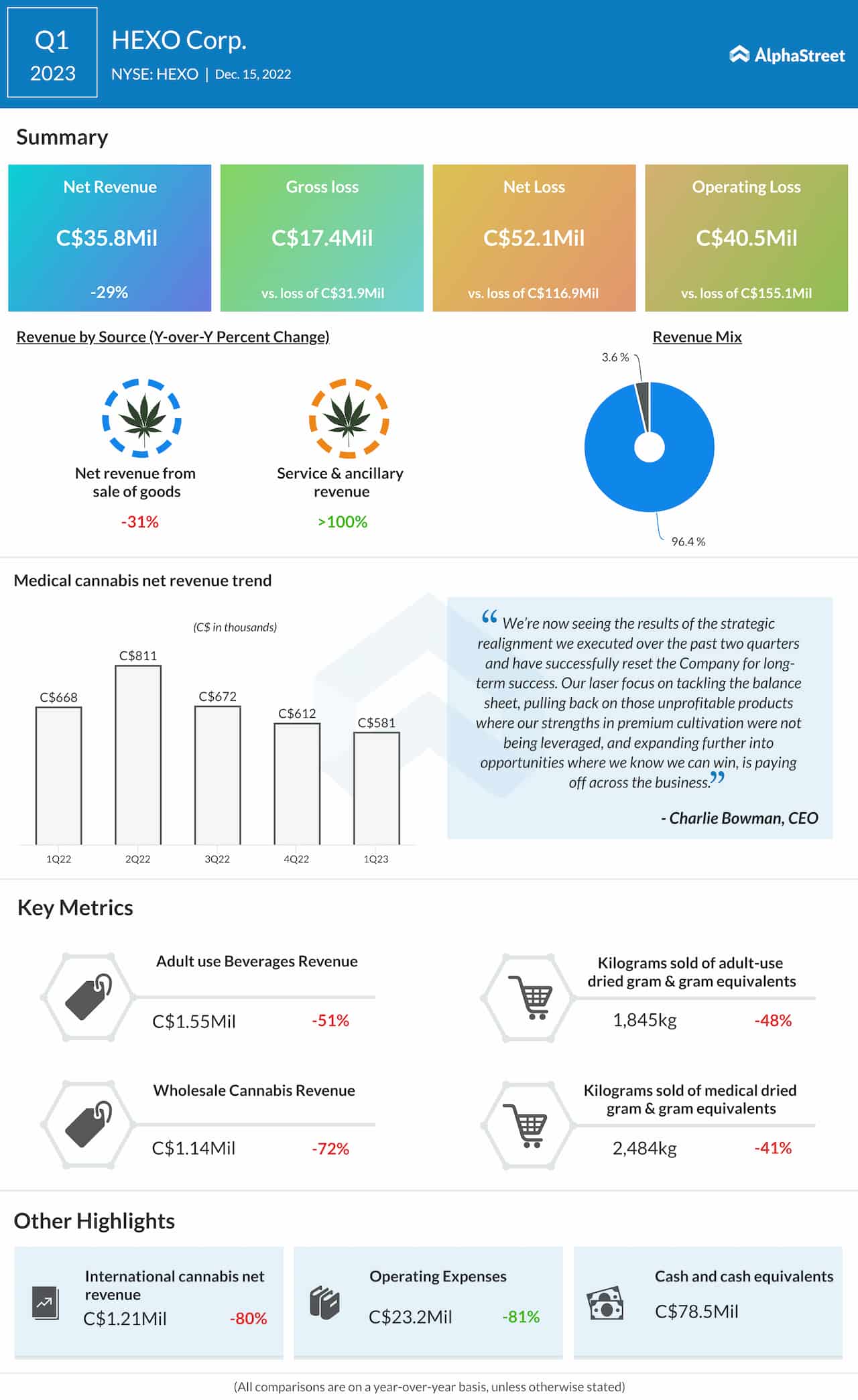 Cannabis producer HEXO Corp. (NASDAQ: HEXO) has reported a narrower net loss for the first quarter of 2023 amid a sharp fall in operating expenses. The Canada-based company’s revenues decreased in double-digits during the three-month period.