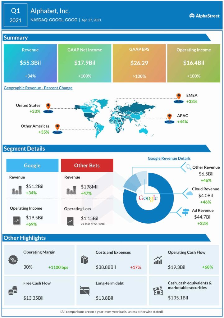 The company, which owns internet search platform Google, reported a 41% growth in revenues to $65.12 billion for the third quarter of 2021. Revenue from Google, the largest segment, increased by 40%, with most of it coming from advertising. The top-line also exceeded Wall Street’s projection.