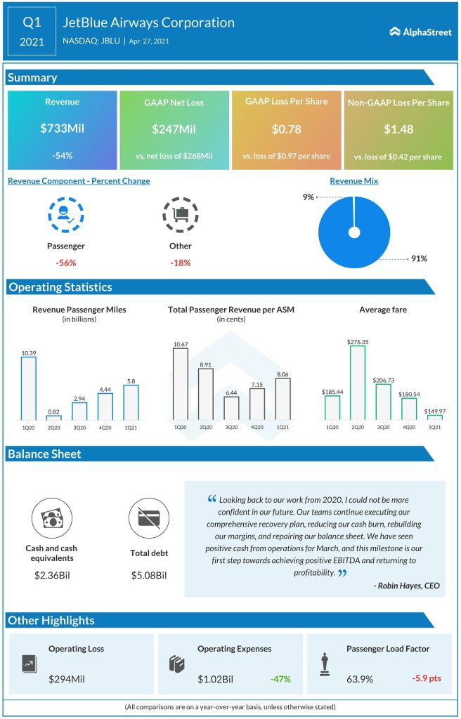 “We believe that demand is once again poised to re-accelerate into the peak holiday periods and beyond as people continue to adjust to a new normal. We are marching towards a full recovery and a return to sustained profitability, with margin as our north star,” said Robin Hayes, JetBlue’s chief executive officer.