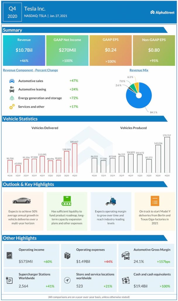 Tesla Inc. (NASDAQ: TSLA) on Wednesday said its fourth-quarter earnings rose sharply and topped expectations. Driving the bottom-line growth, revenues rose 65% and came in above analysts’ forecast.