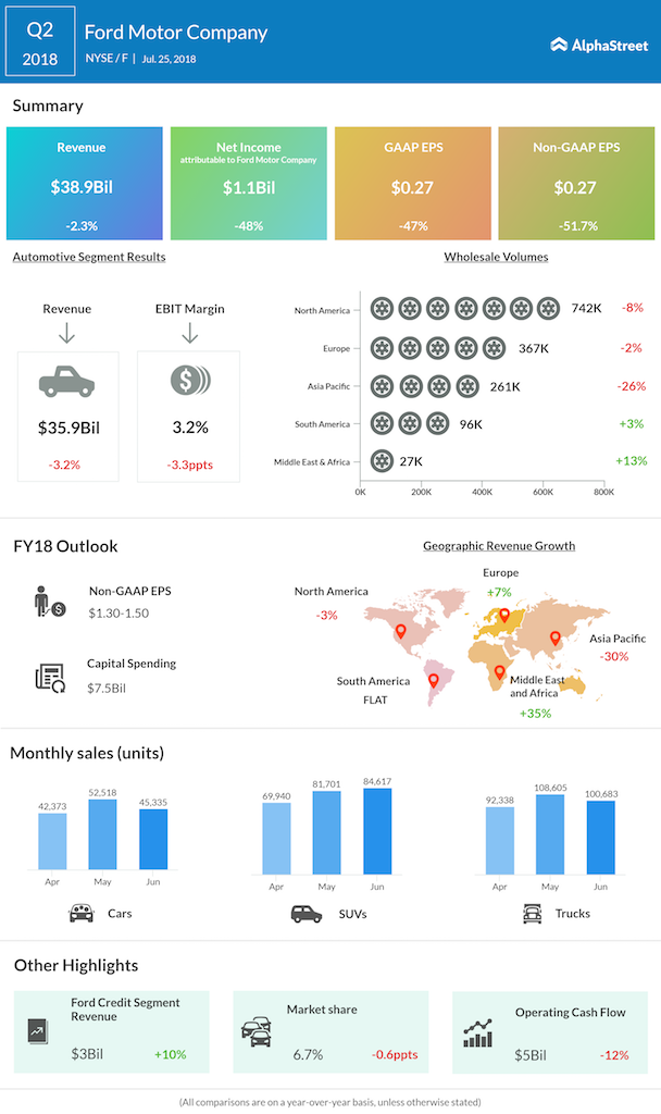 Ford Motor Company (F) reported declines in revenues and earnings for the second quarter of 2018 due to certain production disruption issues at a parts supplier as well as challenges in the China market. Total revenues declined 2.2% to $38.9 billion from the same period last year.