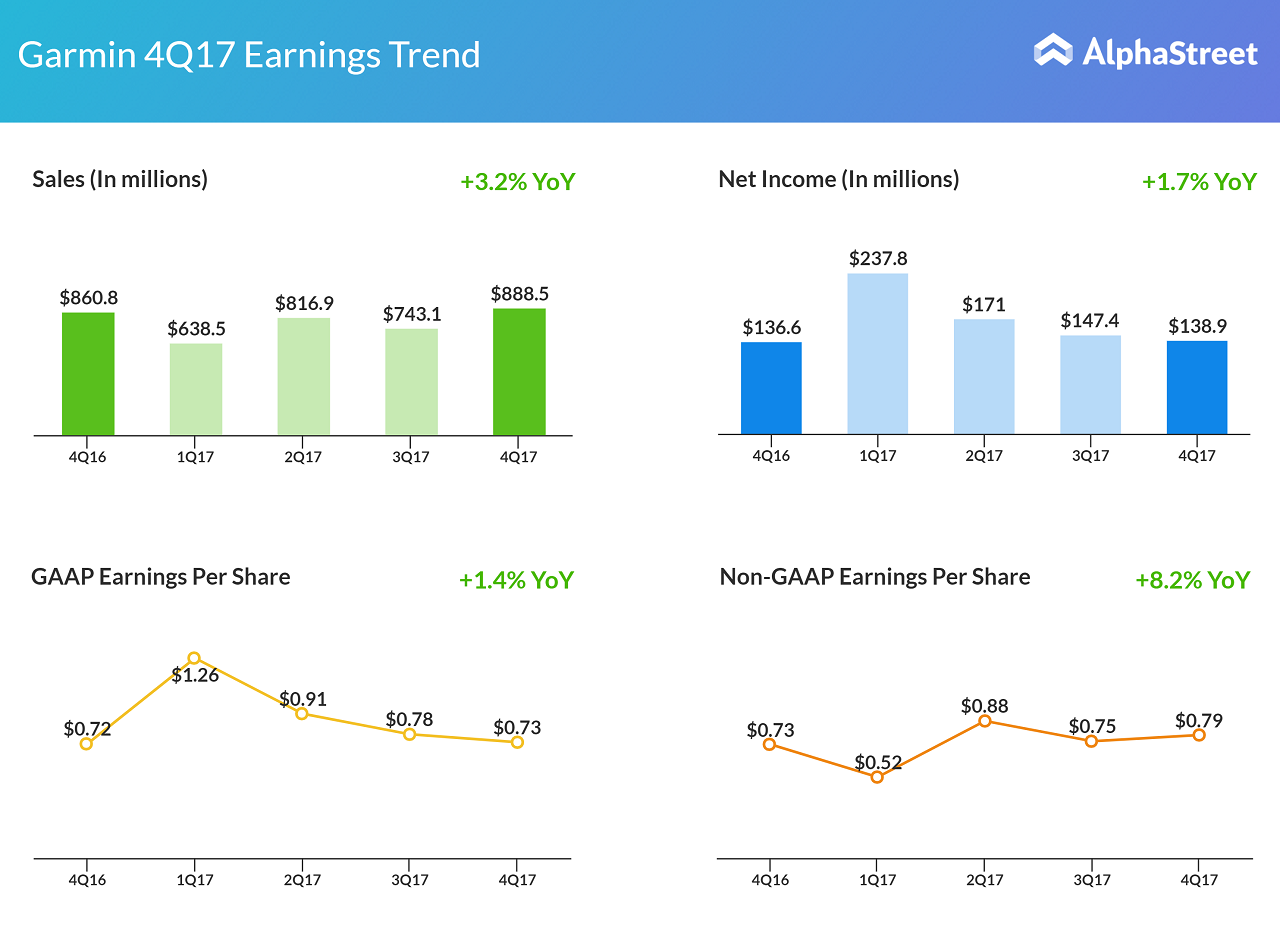 Garmin today reported its fourth quarter 2017 results. The Swiss-based firm saw its sales increase 3% to $888 million vs the same quarter of 2016.