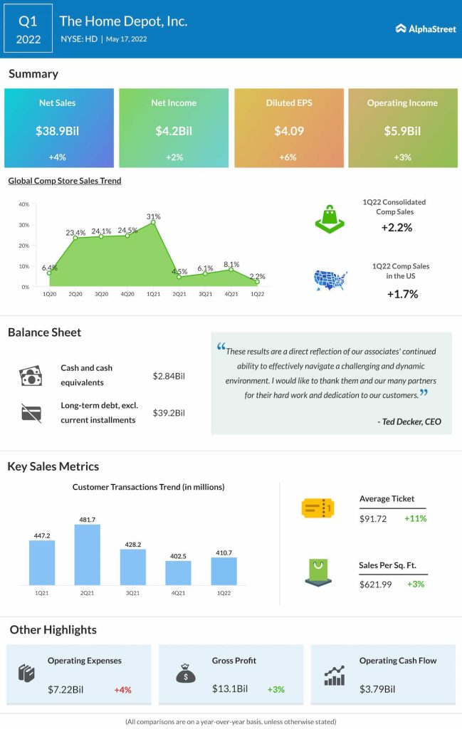 Home Depot generated sales of $38.9 billion in the first quarter of 2022, reflecting an increase of 3.8% from the year-ago period. Comparable sales increased 2.2%. Net earnings rose 6% year-over-year to $4.09 per share. Both the top and bottom line numbers surpassed market expectations.