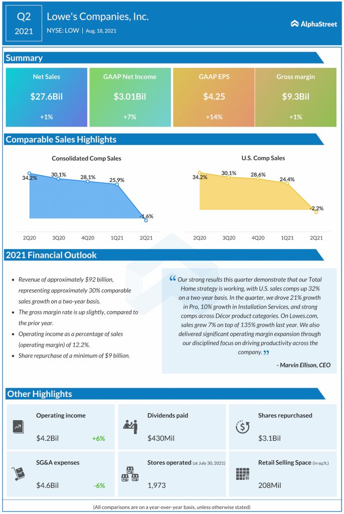 Lowe’s Companies, Inc. (NYSE: LOW) reported second-quarter 2021 financial results before the regular market hours on Wednesday.