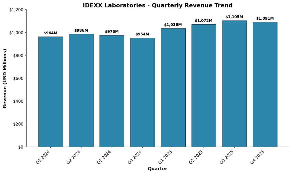 IDEXX Laboratories, Inc. (NASDAQ: IDXX) reported fourth quarter 2025 revenue of $1.09 billion, an increase of 14% as reported and 12% organically compared to the prior year period. The Companion Animal Group segment led performance with $998 million in revenue, up 15% on a reported basis.