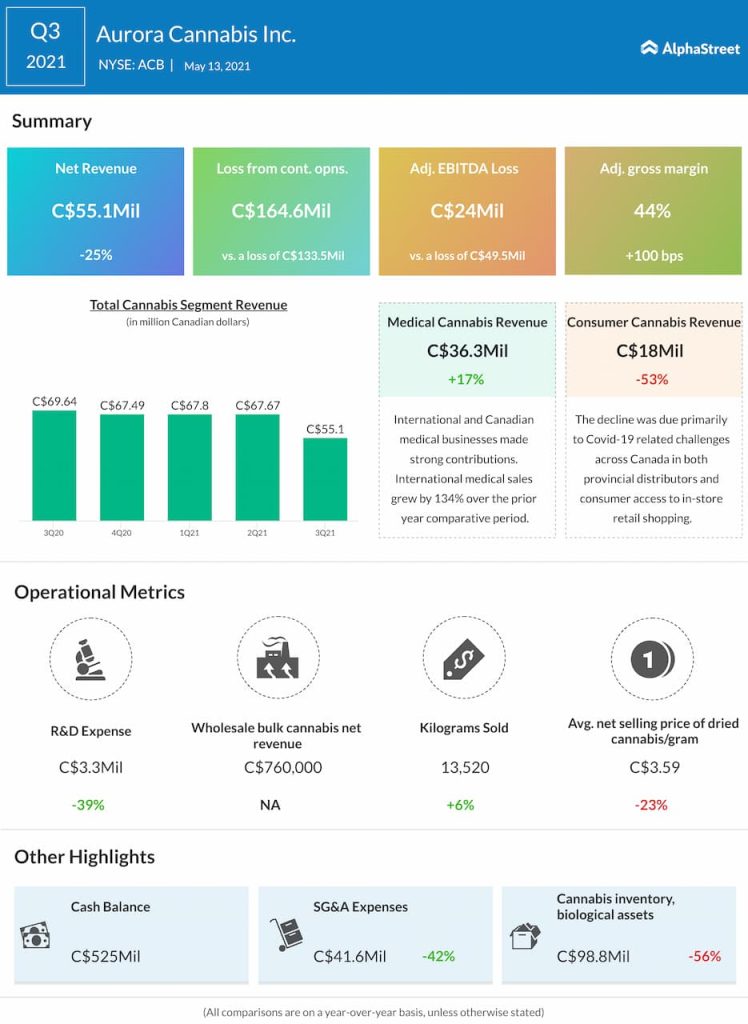 Aurora Cannabis, Inc. (NYSE: ACB) on Thursday reported a narrower net loss for the second quarter of 2022. The company’s revenues dropped 10% year-over-year during the quarter.