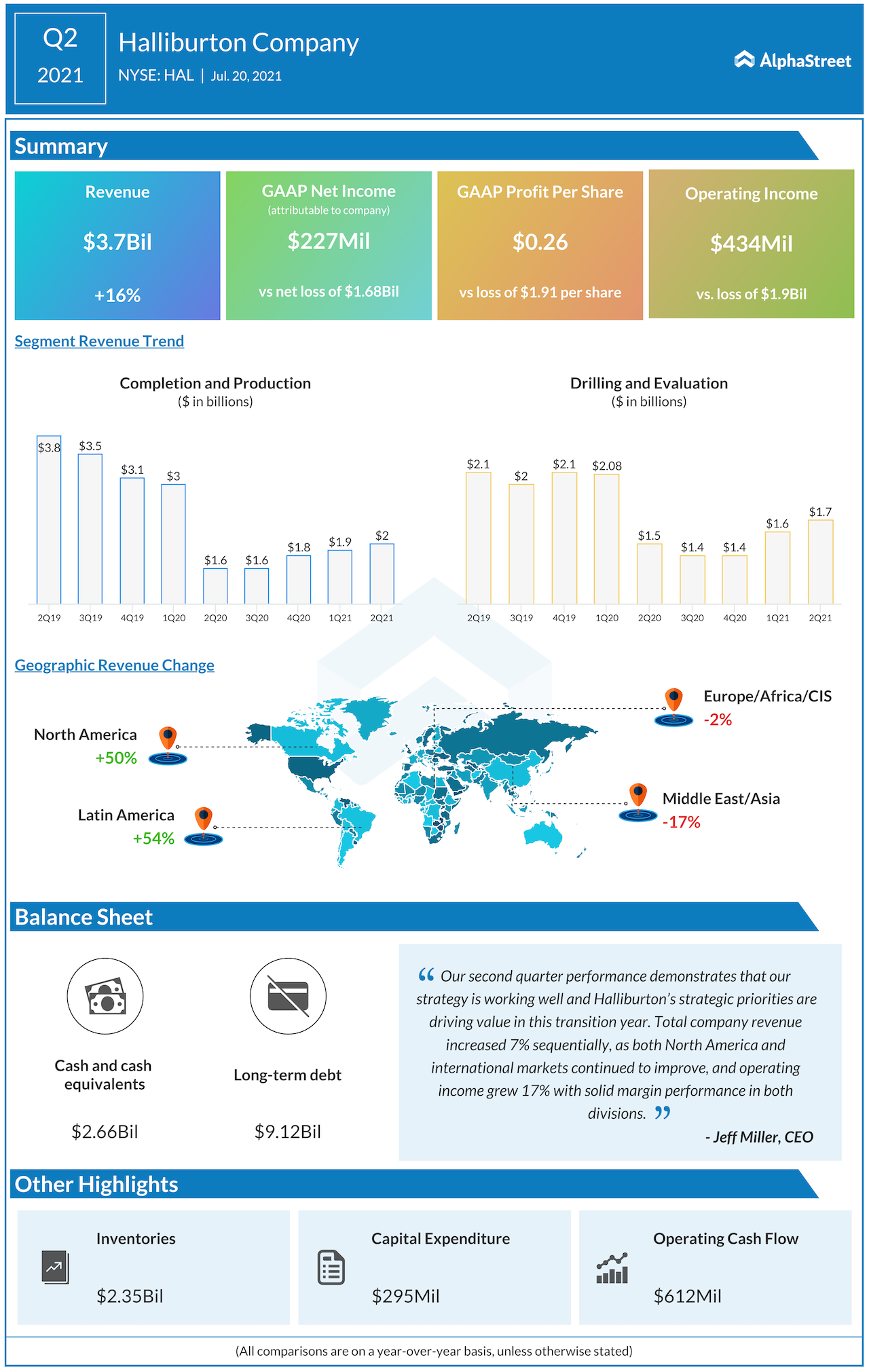 Halliburton (NYSE: HAL) reported second-quarter 2021 financial results before the regular market hours on Tuesday. The drilling equipment mammoth reported Q2 revenue of $3.7 billion, up 16% year-over-year, but short of the Wall Street projection. Meanwhile, net income of $0.26 per share was above the target that analysts had anticipated.