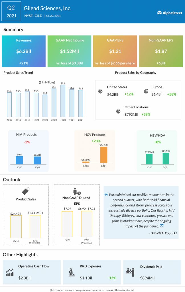 Biopharmaceutical company Gilead Sciences Inc (NASDAQ: GILD) reported its second-quarter 2021 earnings today after the closing bell.