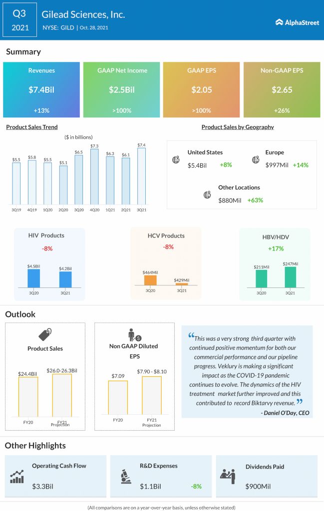 Biopharmaceutical company Gilead Sciences Inc (NASDAQ: GILD) reported its third-quarter 2021 earnings today after the closing bell.