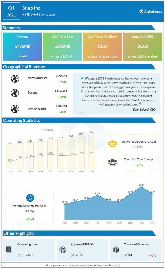 “2021 was an exciting year for Snap and we made significant progress growing our business and serving our global community. The strength of our core business has enabled us to accelerate our investments in augmented reality, transforming the way that the Snapchat community experiences the world through our camera,” said Evan Spiegel, CEO of Snap.