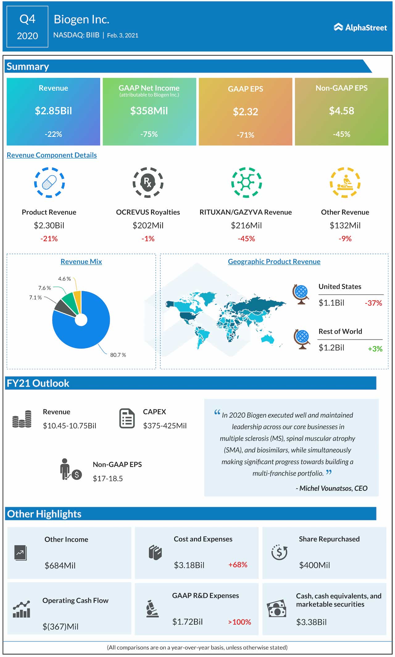 For the full year of 2021, Biogen expects total revenue of $10.45-10.75 billion and adjusted EPS of $17.50-19.00.