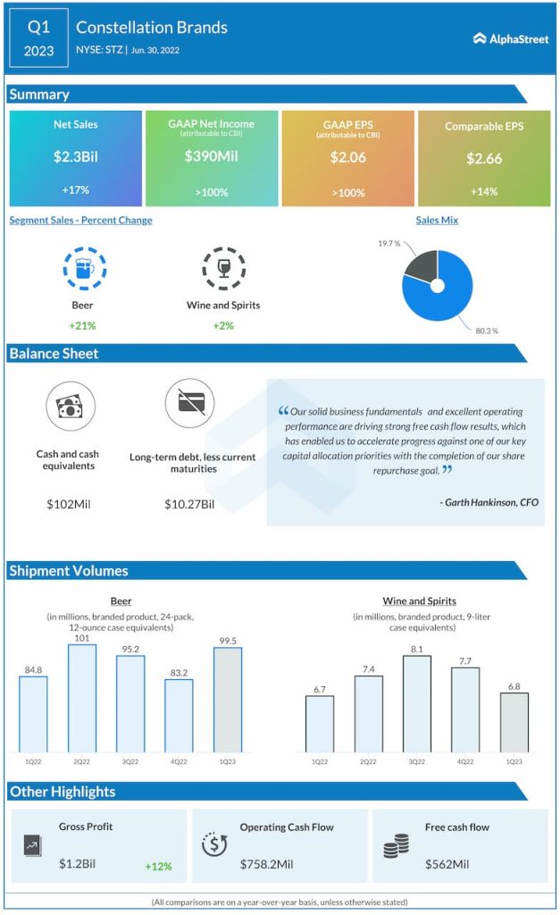 Constellation Brands, Inc. (NYSE: STZ) reported first quarter 2023 earnings results today.
