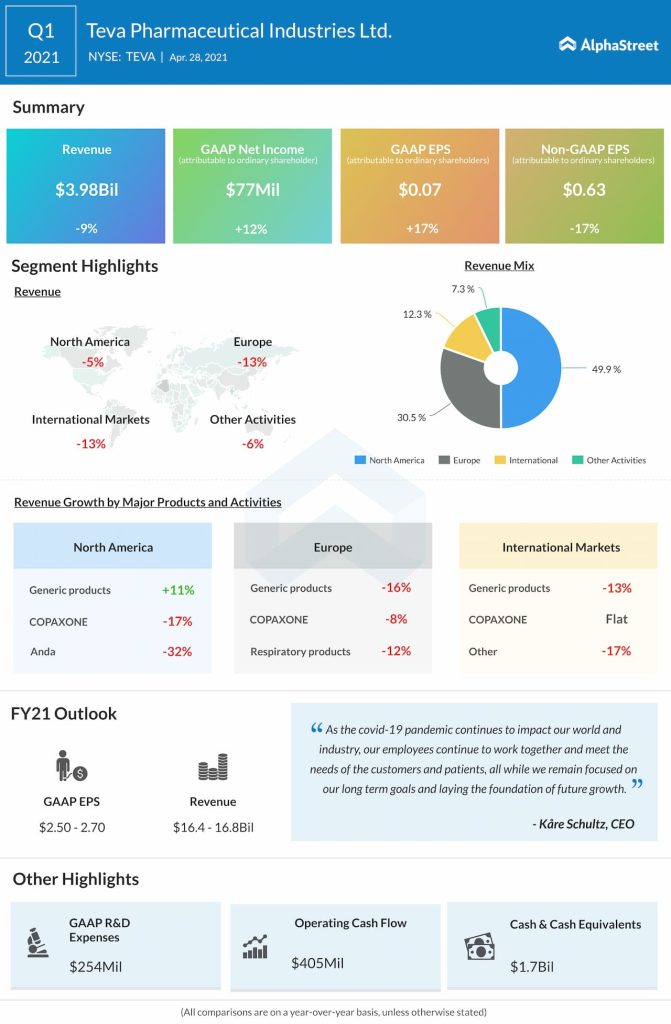Teva Pharmaceuticals’ (NYSE: TEVA) reported first-quarter 2021 results today before the opening bell.