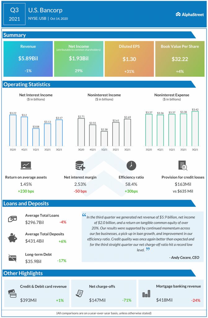 Net income attributable to US Bancorp common shareholders increased to 29% year-over-year to $1.93 billion or $1.30 per share compared to $1.49 billion or $0.99 per share of the same quarter in the previous year.