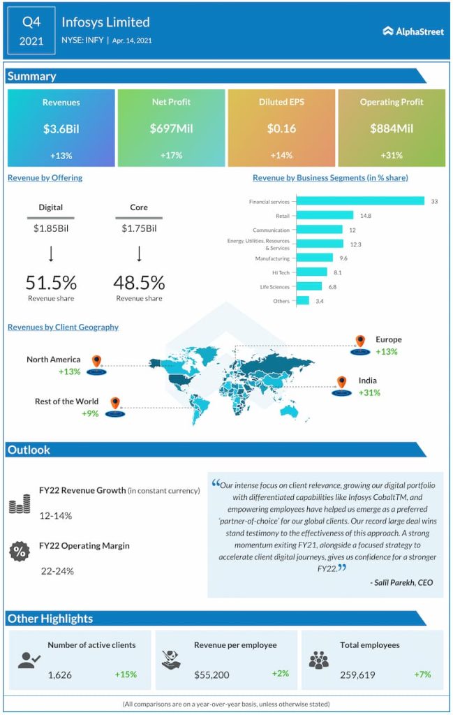 “As we witness a strong market opportunity with global enterprises rapidly accelerating their digital journeys, our sustained investments in expanding capabilities, including the differentiated cloud play, Infosys Cobalt, has uniquely positioned us to continue serving our clients effectively, gain market share and emerge as the preferred cloud and digital transformation partner in the market,” said Salil Parekh, CEO of Infosys.