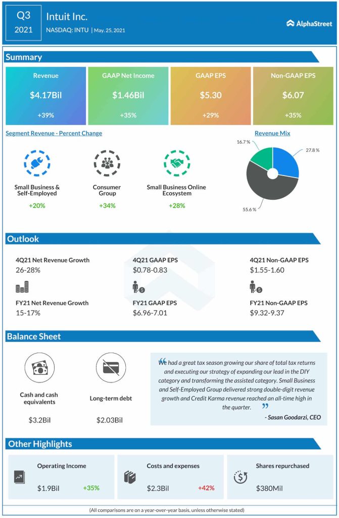 Intuit’s shares traded higher on Tuesday and closed the session at a record high. They gained further in the after-hours, soon after the earnings announcement.