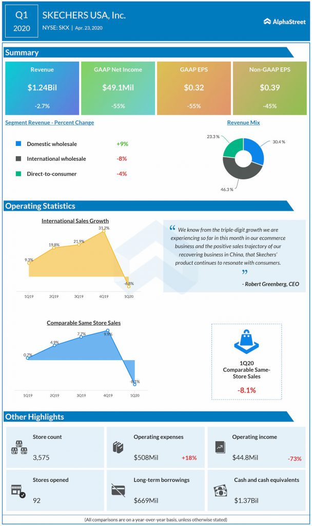 According to initial estimates, Skechers recorded triple-digit growth in e-commerce sales in the early weeks of the current fiscal quarter. Also, the company has started reopening stores in areas where the curbs have been relaxed, including China where most of its products are manufactured. On the flip side, the deteriorating Sino-US ties and macro issues, which added to the present crisis, remain a concern for US-based producers like Skechers.