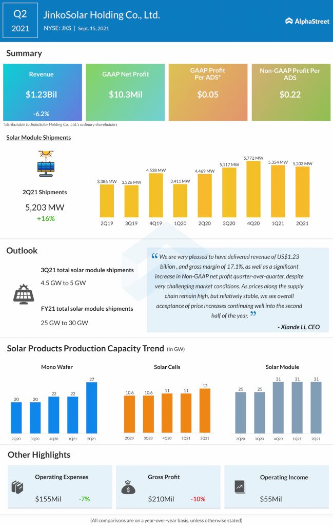 JinkoSolar Holdings Co. (NYSE: JKS) reported second-quarter 2021 earnings results today.