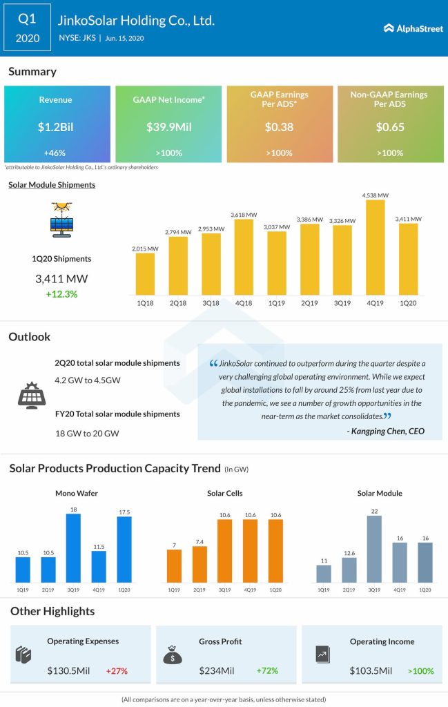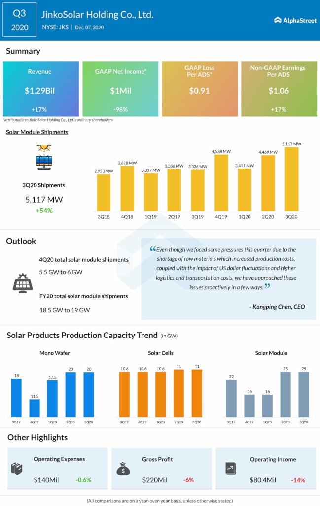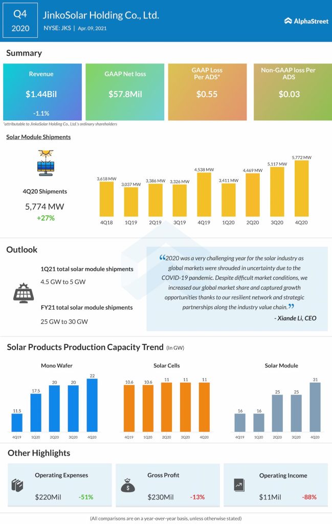 JinkoSolar Holdings Co. (NYSE: JKS) reported fourth-quarter 2020 earnings results today.