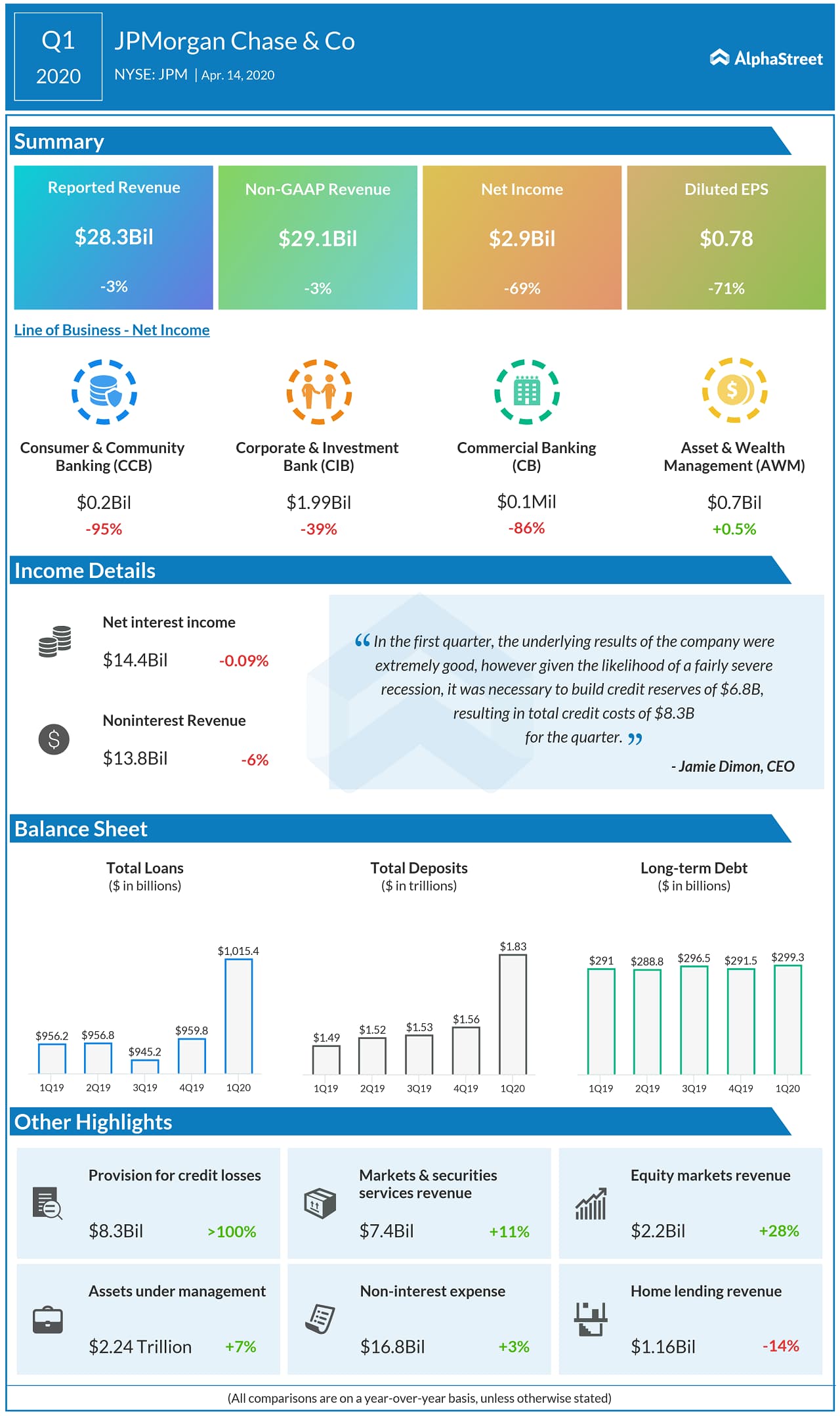 Net income fell 51% to $4.7 billion, or $1.38 per share, driven by reserve builds across the firm.