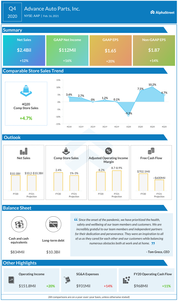 Advance Auto Parts, Inc. (NYSE: AAP) reported fourth-quarter 2020 earnings results today.
