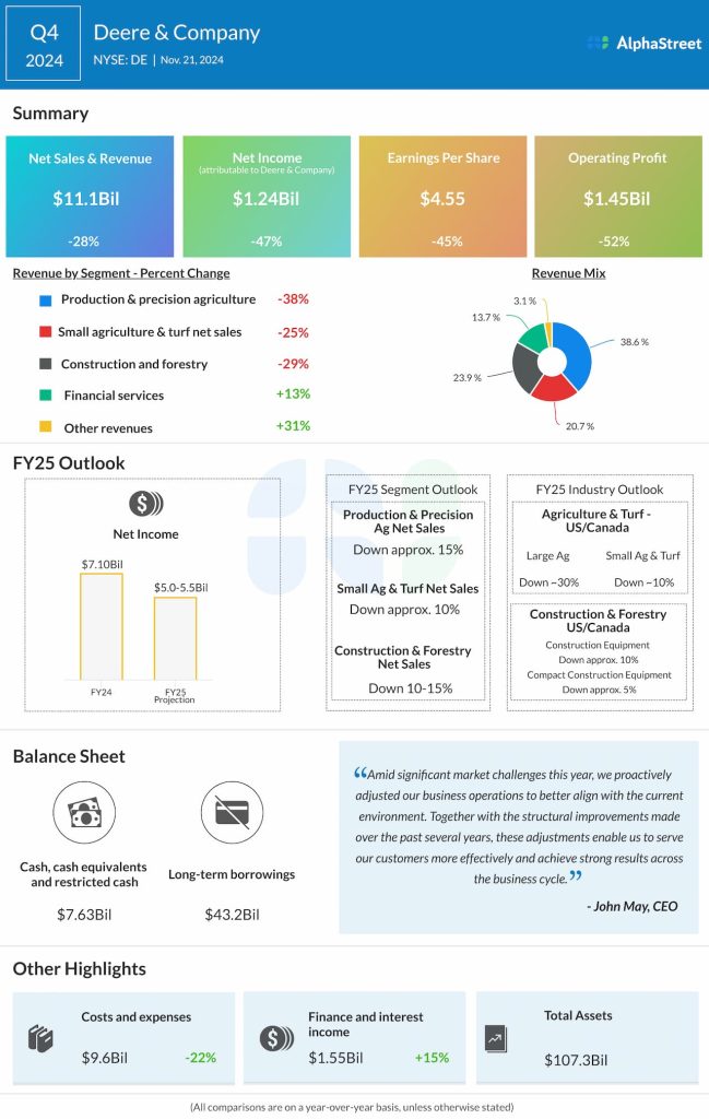 Deere & Company (NYSE: DE) reported its fourth quarter 2024 earnings results today.