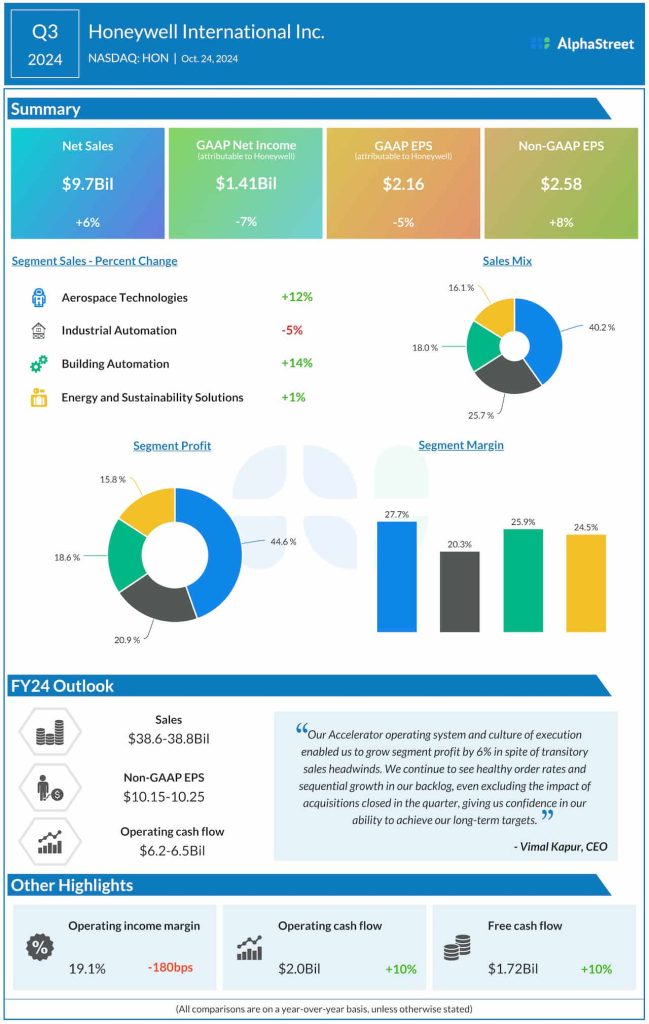 Net income attributable to Honeywell was $1.28 billion compared to $1.26 billion last year.
