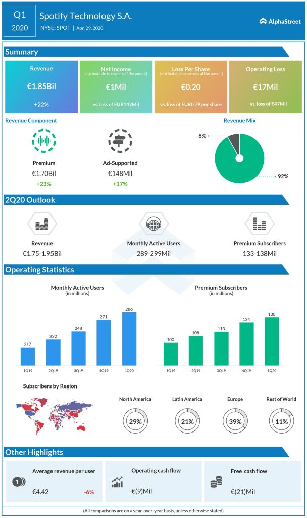 Spotify Technology S.A. (NYSE: SPOT) reported first-quarter 2021 earnings results today.