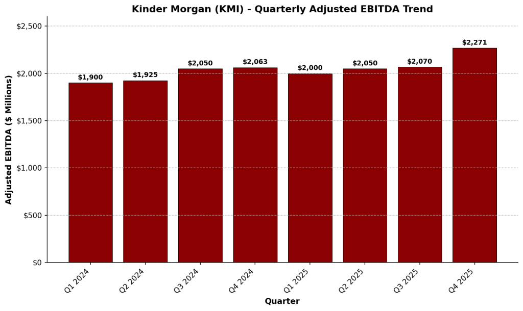 For full-year 2025, Kinder Morgan reported net income attributable to KMI of $3.056 billion, up 17% from $2.613 billion in 2024. Full-year revenues were $16.937 billion compared with $15.100 billion in 2024. Adjusted EBITDA for the year was $8.391 billion, up 6% from $7.938 billion. The company generated cash flow from operations of $5.917 billion and free cash flow of $2.891 billion.