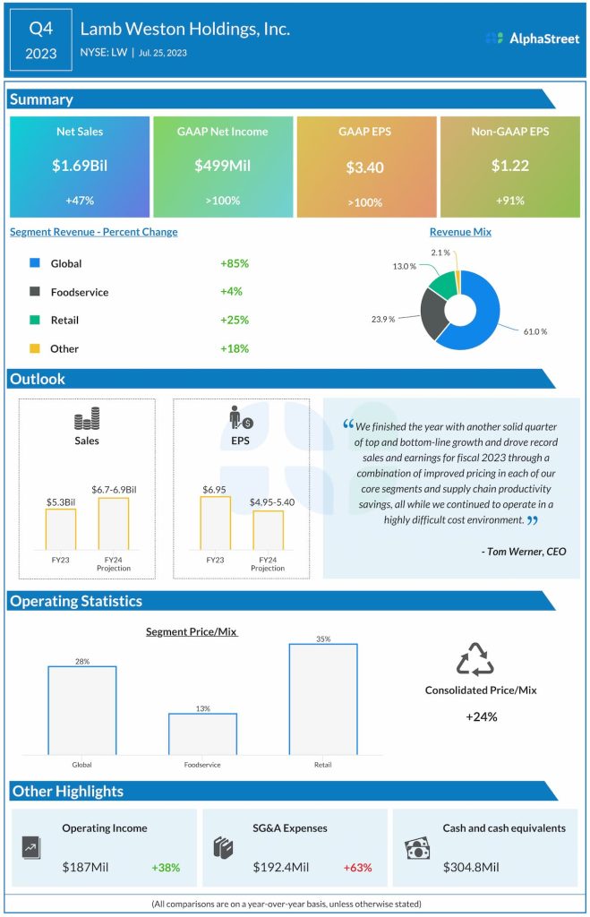 Lamb Weston Holdings, Inc. (NYSE: LW), a leading supplier of frozen potato products to restaurants and retailers, reported lower adjusted earnings for the third quarter of 2024, despite a double-digit increase in net sales.