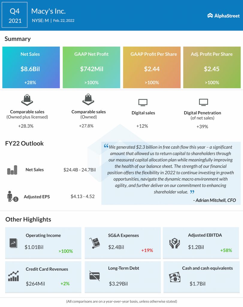 Macy’s, Inc. (NYSE: M) reported fourth-quarter 2021 earnings results today.