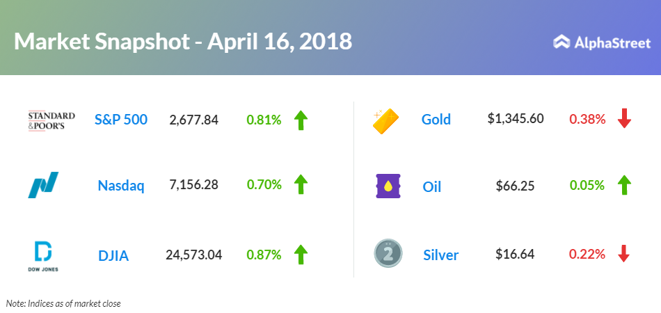 On April 16, US ended higher, with Dow up 0.87% to 24,573.04. Nasdaq gained 0.70% to 7,156.28, and the S&P 500 advanced 0.81% to 2,677.84. Traders reacted positively to earnings news from Bank of America (BAC), which posted better-than-expected first quarter earnings backed by strong loan growth. A Commerce Department report showed that retail sales increased 0.6% in March after falling 0.1% in February.